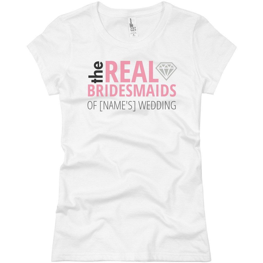 So cute! Customize a "real bridesmaids" and all the girls in the bridal party! Add the bride's name to this shirt with the diamond on it. Perfect to wear at the bachelorette party. It's a parody of the Real Housewive's logo and that means it qualifies as Fair Use. Get the matching tee for the bride!