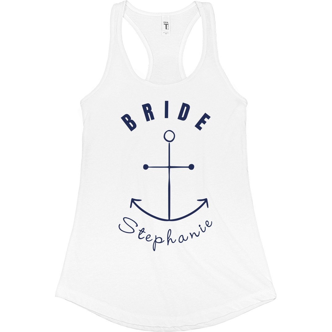 Make this custom tank top for the bride, and then make matching tank tops for her "Bride Mates". The bride gets a white tank with blue ink and the rest of the bachelorette party gets blue tanks with white inks. It's perfect for your next nautically-themed bachelorette or bridal party.