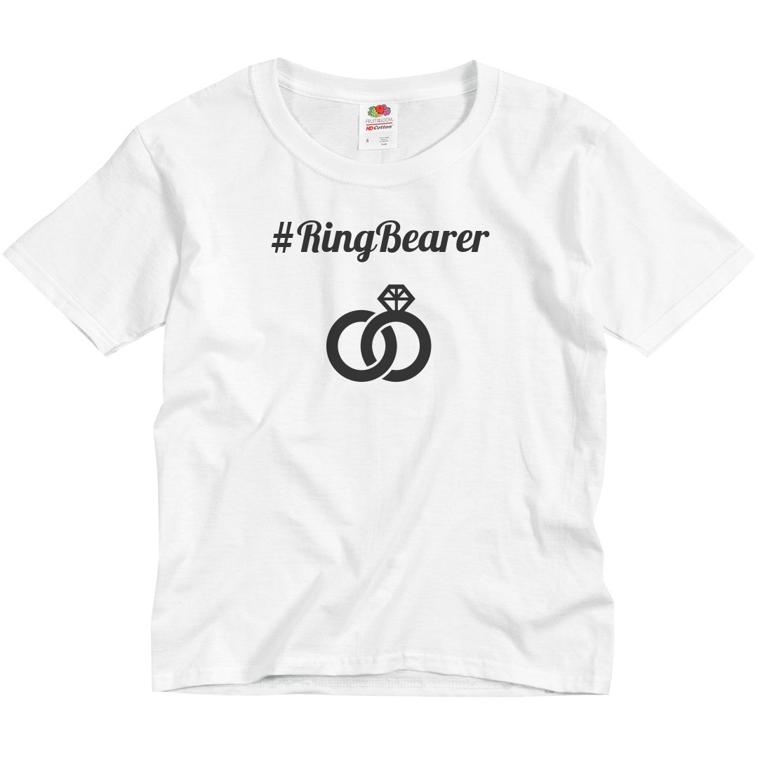 A simple design for the ring bearer to wear. The text reads: #RingBearer and there is a set of wedding rings below the text. Perfect for the wedding rehearsal and dinner.
