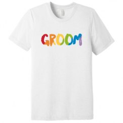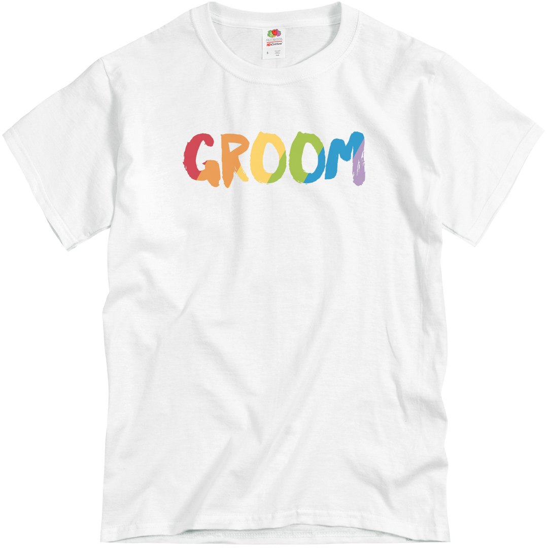A rainbow colored text with the word groom stands out on this white cotton tee. Let him show off that he is the groom with this cute rainbow colored groom shirt and we also offer a colorful bride white t-shirt so she can match her groom.