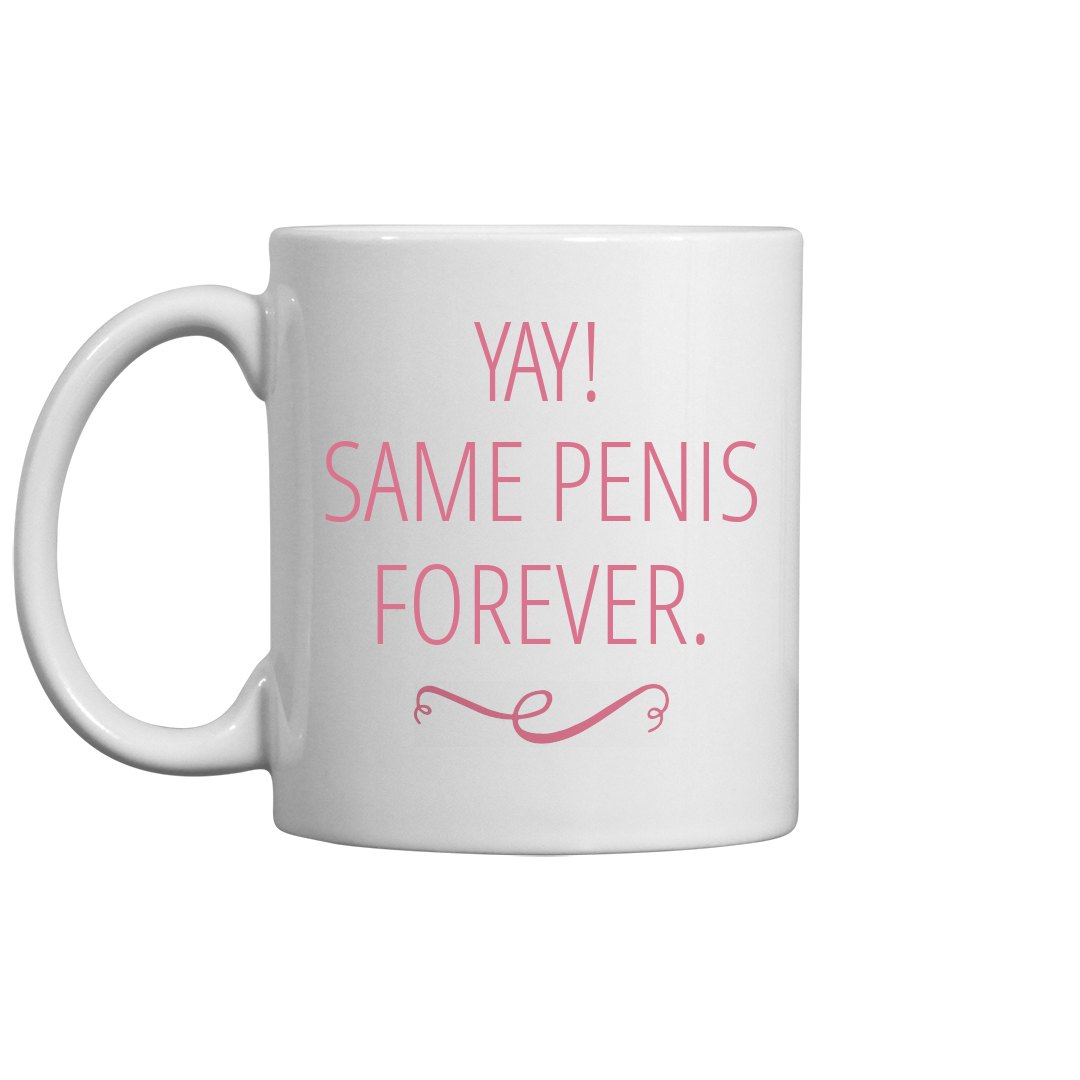 Yay, same penis forever! Get this hilarious mug, and let your partner know that you're pumped that you only have eyes for him until the end of time! Great gag gift for the bride.
